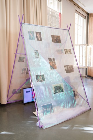Die Installation (m)Otherhood verhandelt Vorurteile, gesellschaftlichen Druck, Normen und Zukunftsimaginationen visuell – in Kooperation mit Interviewpartner*innen und künstlicher Intelligenz sind neue, positive Bilder kinderfreier Lebensentwürfe entstanden, die sich mit Stimmen aus sozialen Netzwerken und historischen Postkarten in einer Collage aus Stoffen verweben und durch einen 26-minütigen Desktop-Film kontextualisiert werden: Interview-Fragmente, Social-Media-Sequenzen und gefundene Videos verbinden sich in einer Choreografie meiner Recherche und vertiefen die Installation zu einem Raum der Reflexion.